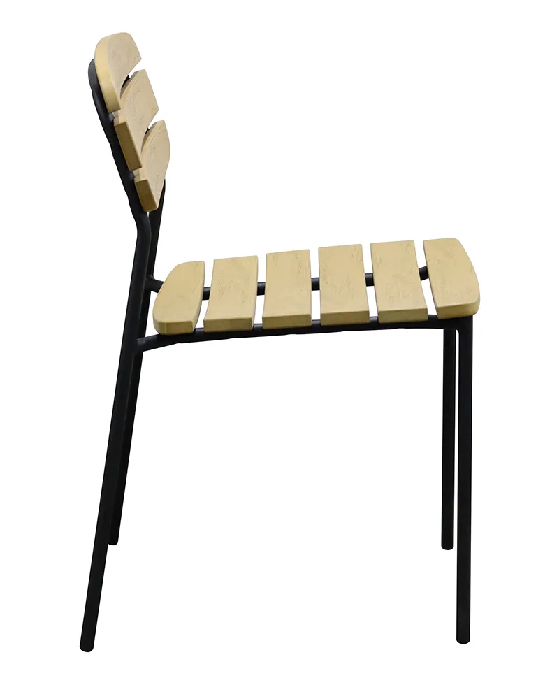 Con struttura in metallo trattato antiruggine e verniciatura a polvere, la sedia Etoile è pensata per durare. Seduta e schienale in resina effetto legno tinta teak offrono comfort e uno stile naturale. È adatta sia a spazi interni che esterni nel settore hospitality.