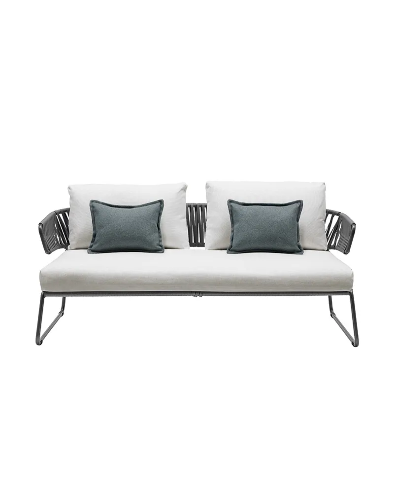 Haze è un divano che propone una seduta elegante per l’outdoor, con telaio metallico a slitta che garantisce stabilità e schienale intrecciato in estruso di PVC. I cuscini, generosi e resistenti alle intemperie, offrono comfort prolungato. Una soluzione raffinata per lounge, terrazze e spazi contract contemporanei.
