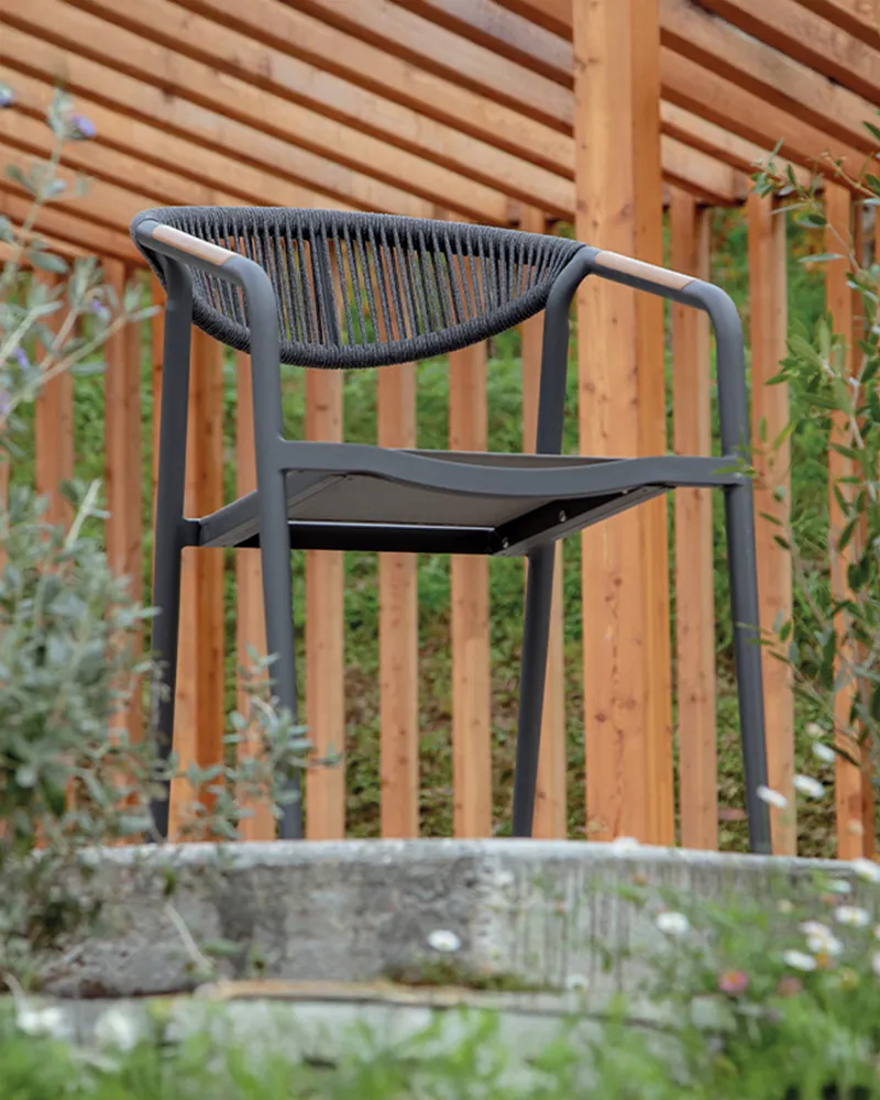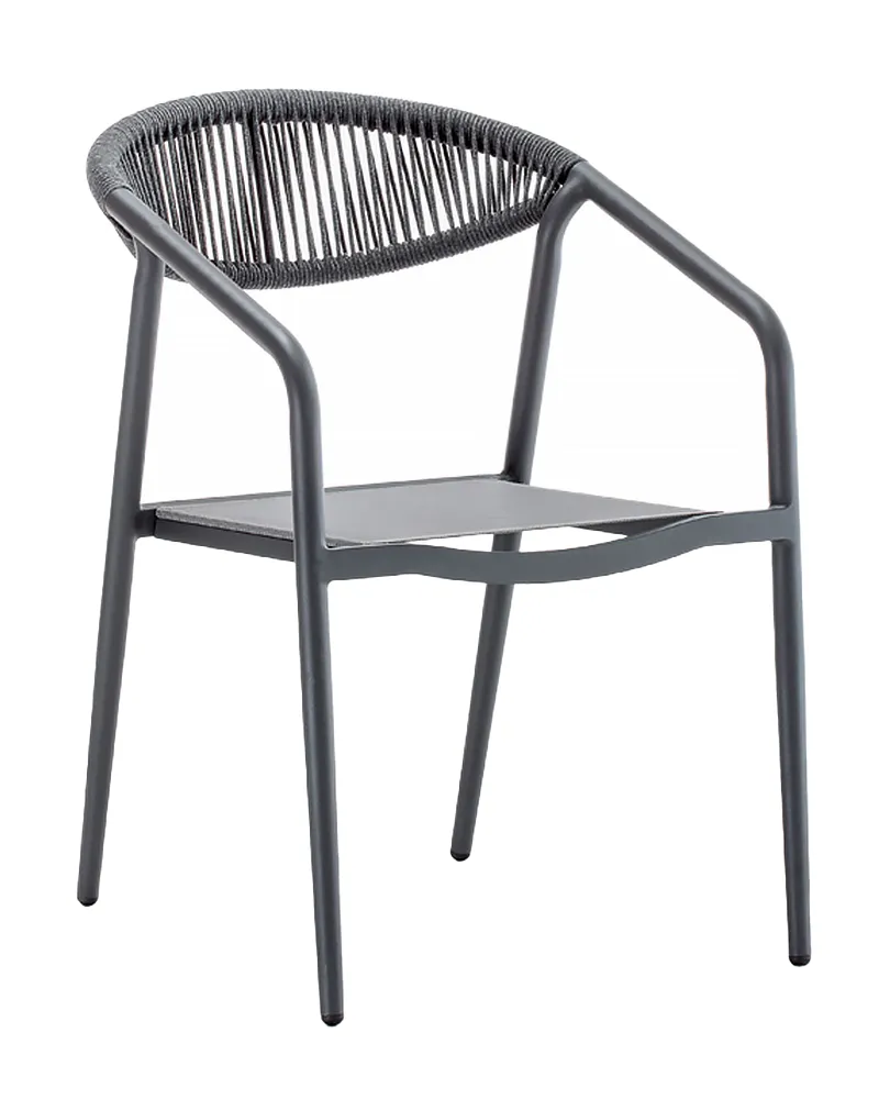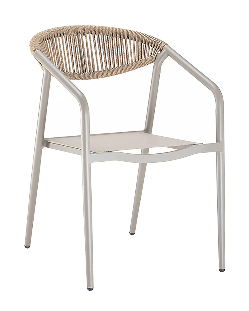 Moderna e accogliente, la poltroncina Seoul combina una struttura in alluminio verniciato — disponibile in antracite o tortora — con schienale in corda acrilica intrecciata e seduta in textilene. È perfetta per bar, ristoranti, hotel e ambienti esterni che richiedono stile e praticità.