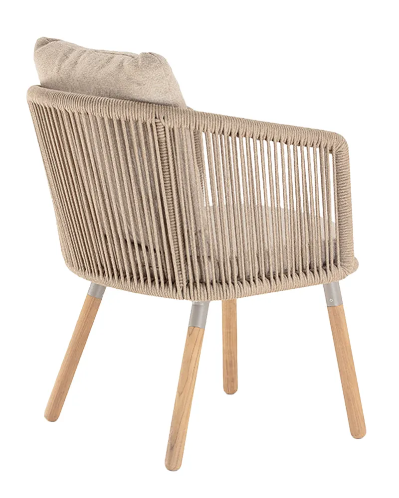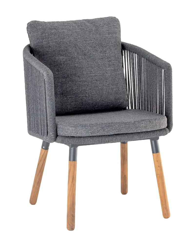 La poltroncina Welle abbina eleganza e comfort con una struttura in alluminio verniciato, gambe in teak e seduta in corda, poliestere intrecciata. La cuscineria sfoderabile in tessuto acrilico aggiunge morbidezza e resistenza. Ideale per lounge, terrazze e aree relax dall’estetica naturale e ricercata.